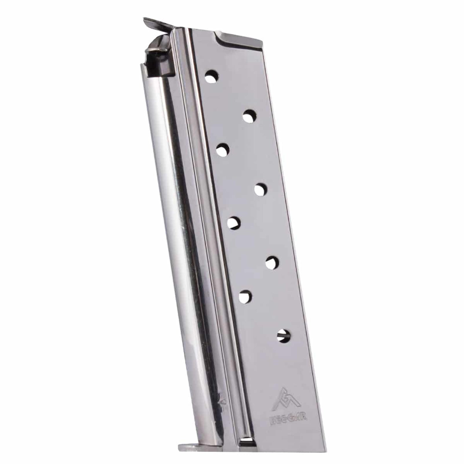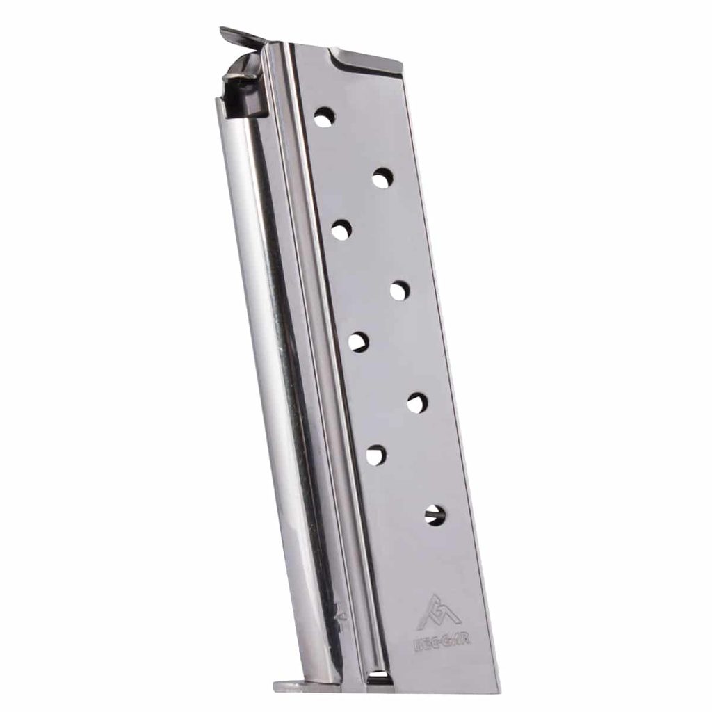 Zásobník od společnosti Mec-Gar pro pistole typu 1911 Govertment & Commander - full size (standardní rukojeť), pro ráži 10 mm Auto, 8 ran, niklovaný. Snadná rozebiratelnost a vysoká spolehlivost.