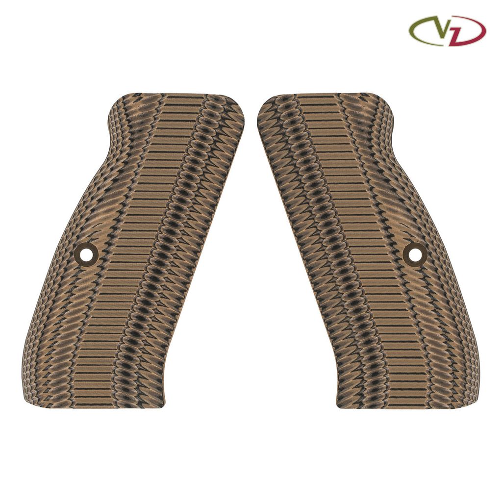 Střenky světoznámé společnosti VZ Grips pro pistole typu CZ 97. Materiál G10, barva Hyena Brown (písková a hnědá). Zdrsnění je střední úrovně tedy citelné při úchopu, ale ne nepříjemné. Toto zdrsnění napodobující hřbet aligátora bylo původně navrženo pro Precision Weapons Section of the U.S. Marine Corps.