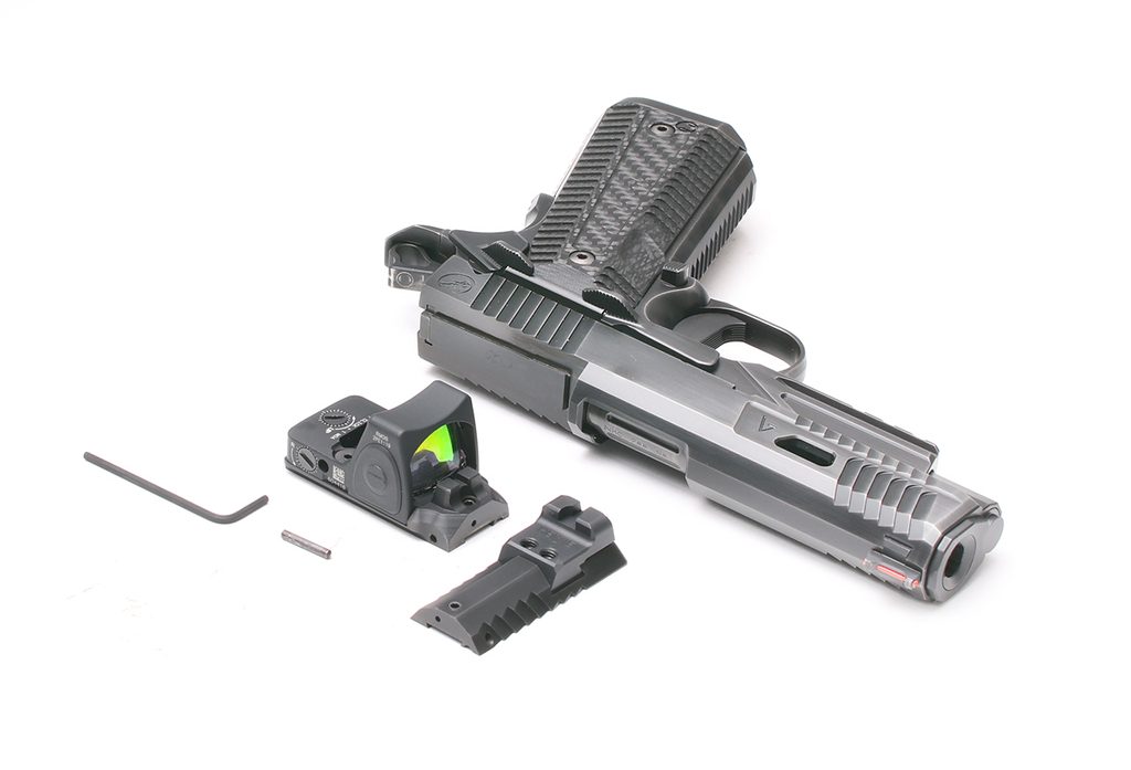 Everything you could possibly want in an optic solution. The IOS is adaptable to your needs and allows for a low-profile red dot mount with the versatility to switch rear sights in a matter of seconds. With the dovetail cut in the slide, each plate can be removed and still return to zero. This allows you to switch your rear sight quickly and easily without sacrificing aesthetic or function. The cocking serrations have been cut into the plate and hand blended so perfectly, that most people would never notice the cut. This is available on new builds as an upgrade, and is also available to be cut on most existing 1911s, no matter the brand.