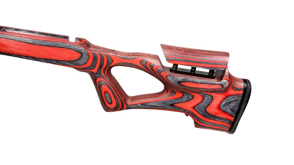 This model has an angled pistol grip, which enables the shooter to use the stock with perfect comfort while standing. The thumb hole provides a more relaxed position for shooting while holding the gun.